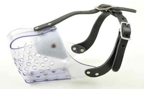 The muzzle is made of Clear vinyl or Black polyethylene plastic with reinforced neoprene or leather straps. The clear is flexible vinyl, and available in all sizes/brands mentioned, comes as shown with a single strap configuration or with a "third strap" that extends from the bridge of the dog's nose up between the eyes to connect with the strap behind the ears. Available as shown or with a large "treat hole" in front for most sizes.
